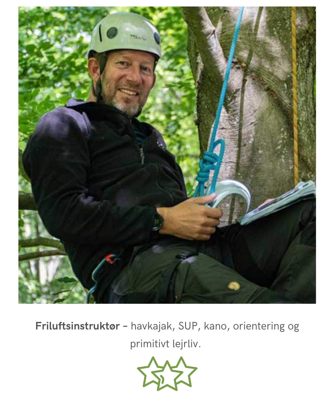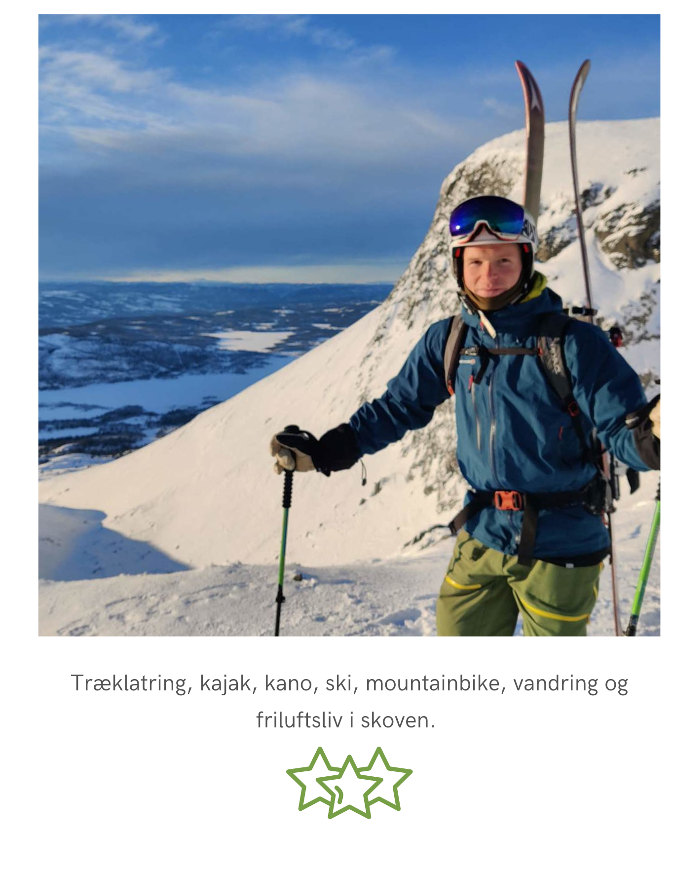 Mathias kommer med erfaring indenfor træklatring, kajak & kano, ski, mountainbike, vandring og basisfriluftsliv i skoven. Derudover har han boet i Norge og fået den norske friluftstradition ind under huden. I fritiden udfordrer han sig selv med at surfe og spontane ture ud i det fri.